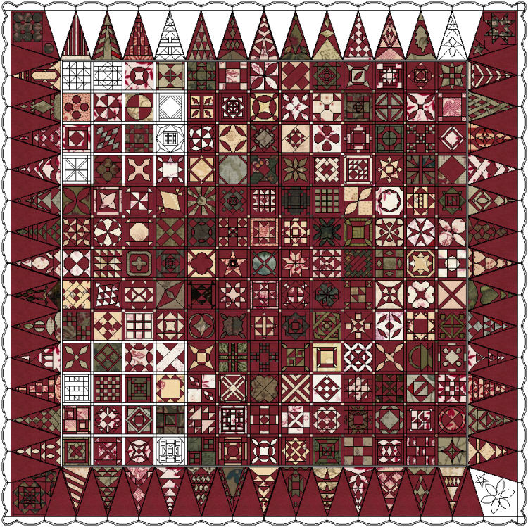 The intent of this page is to show the progress I’ve made on the Dear Paulette quilt. As I complete individual blocks, they will be colored in on the picture above.